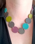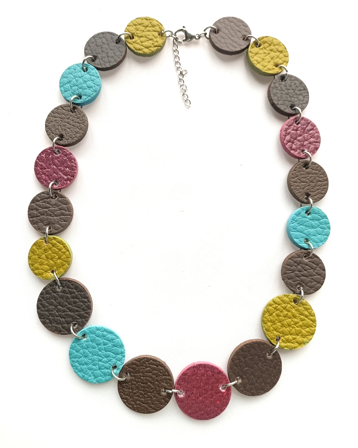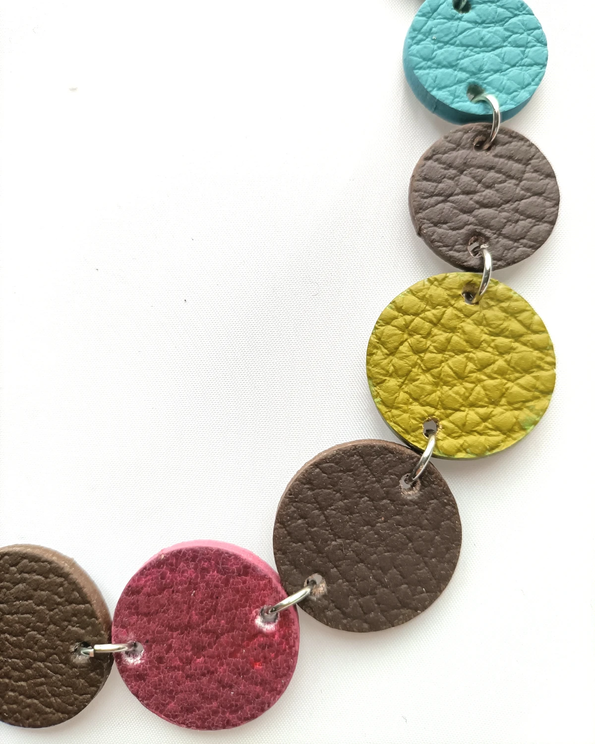Ręcznie wykonany naszyjnik z naturalnych skór połączonych srebrnymi stalowymi kółeczkami.