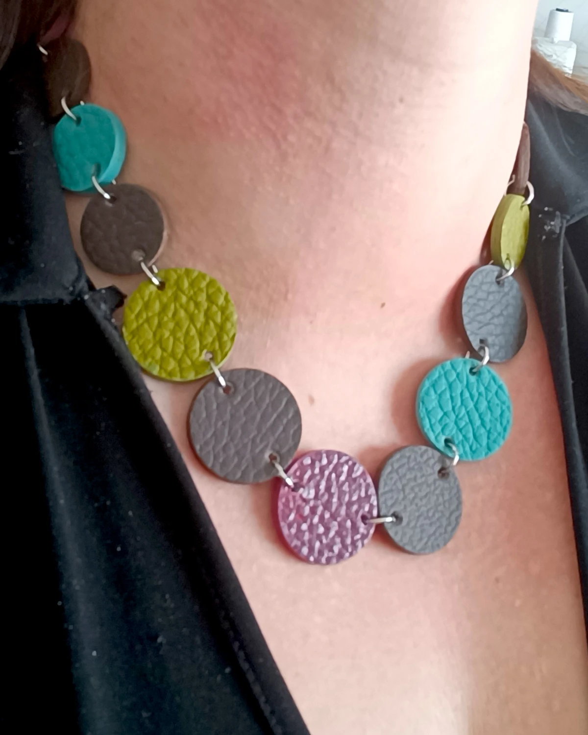 Unikatowa bizuteria skórzana handmade o kasycznej kontrastowej kolorystyce.