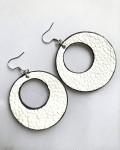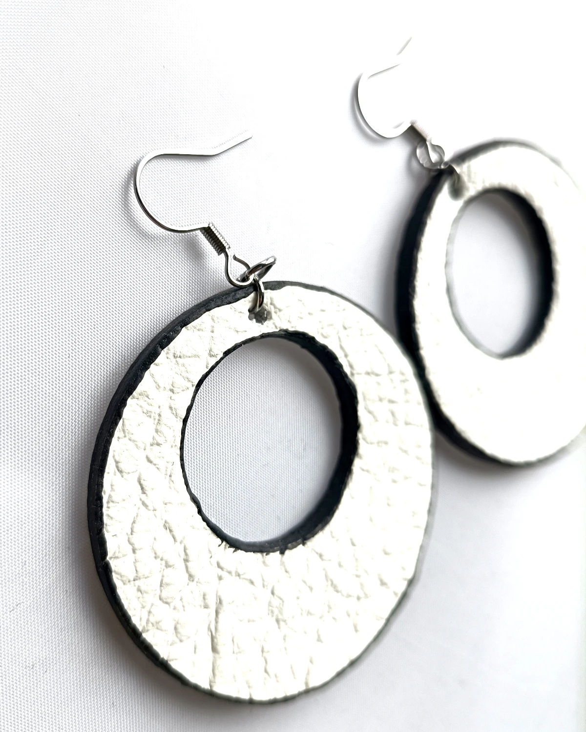 Skórzane kolczyki wiszące duże koła 5cm, stal chirurgiczna, Białe